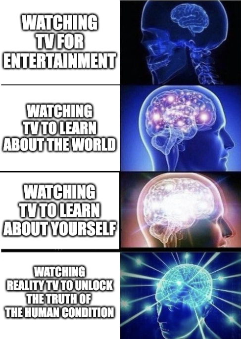 My favorite part of Reality TV is the name. It is so blatant in its inaccuracy that it perfectly gives away the entire game right at the beginning. Just as the country’s chief warmaking bureau is named the Department of Defense, “news” has become subservient to attention, and mental health struggles amongst youth are skyrocketing due to absurd aesthetic expectations driven by Instagram filters, “Reality TV” begins the entire premise off with a lie. There’s nothing “real” about it! Clever editing tricks as well as forced or even staged situations designed to promote entertainment do not reality make. It’s the perfect content for the American nation. In a country where we routinely listen to junk coming out of all official news sources and hell, even the unofficial ones, where disinformation could be considered a national pastime, why wouldn’t our entertainment branded as “reality” be full of shit? It’s only fitting.
